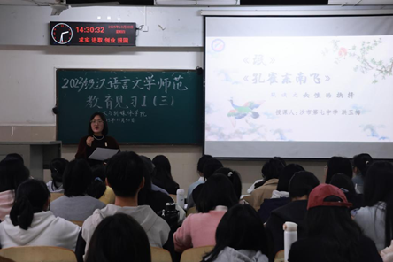 (通讯员 李淼、刘思雨)为提升中文师范专业员工的经典课文教学能力,夯实教育教学素养,2025年10月30日,皇冠集团网站在12教102教室举办教育见习示范课活动。活动特邀沙市第七中学高二语文备课组长洪玉梅老师主讲,周霜、张丽、章芳等老师参与,2023级中文师范专业全体员工参加学习。