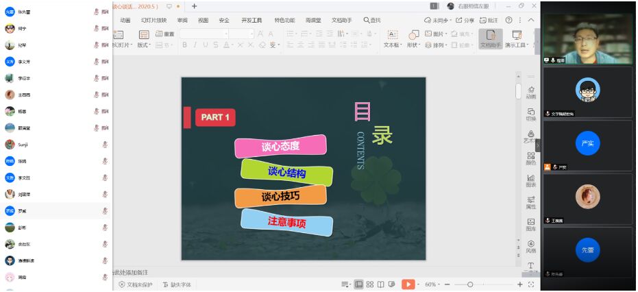 程老师首先从案例分析入手,得出了老师与员工谈心时,应持非指导、接纳、信任和探索的态度的结论。程老师认为,老师与员工谈心时,应与员工平等的交流,认真倾听员工的倾诉,读懂员工真正想表达的内容,从负性的事件中看到正性的期待,了解冲突背后的动机,用信任与真诚对待每一次谈心,从而促进与员工的关系。随后,程老师向老师们详细介绍了一次完整的结构化谈心的操作流程,并对每个流程的注意事项进行了讲解。最后,程老师还向老师们介绍了心理危机的识别与干预。