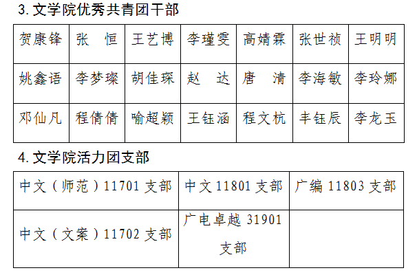 经个人申请、各支部推选、皇冠集团网站团委审核,拟推选毛露孟等46名同学评为“优秀共青团员”,王杰评为“共青团员标兵”,贺康锋等21名同学评为“优秀共青团干部”,中文(师范)11701支部、中文11801支部、广编11803支部、中文(文案)11702支部、广电卓越31901支部评为“活力团支部”,现予以公示。