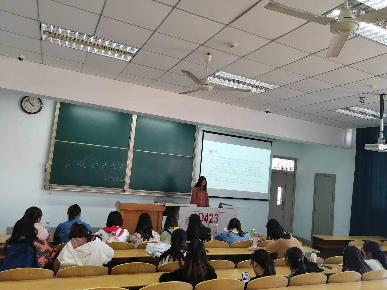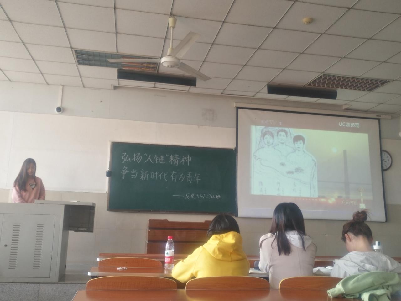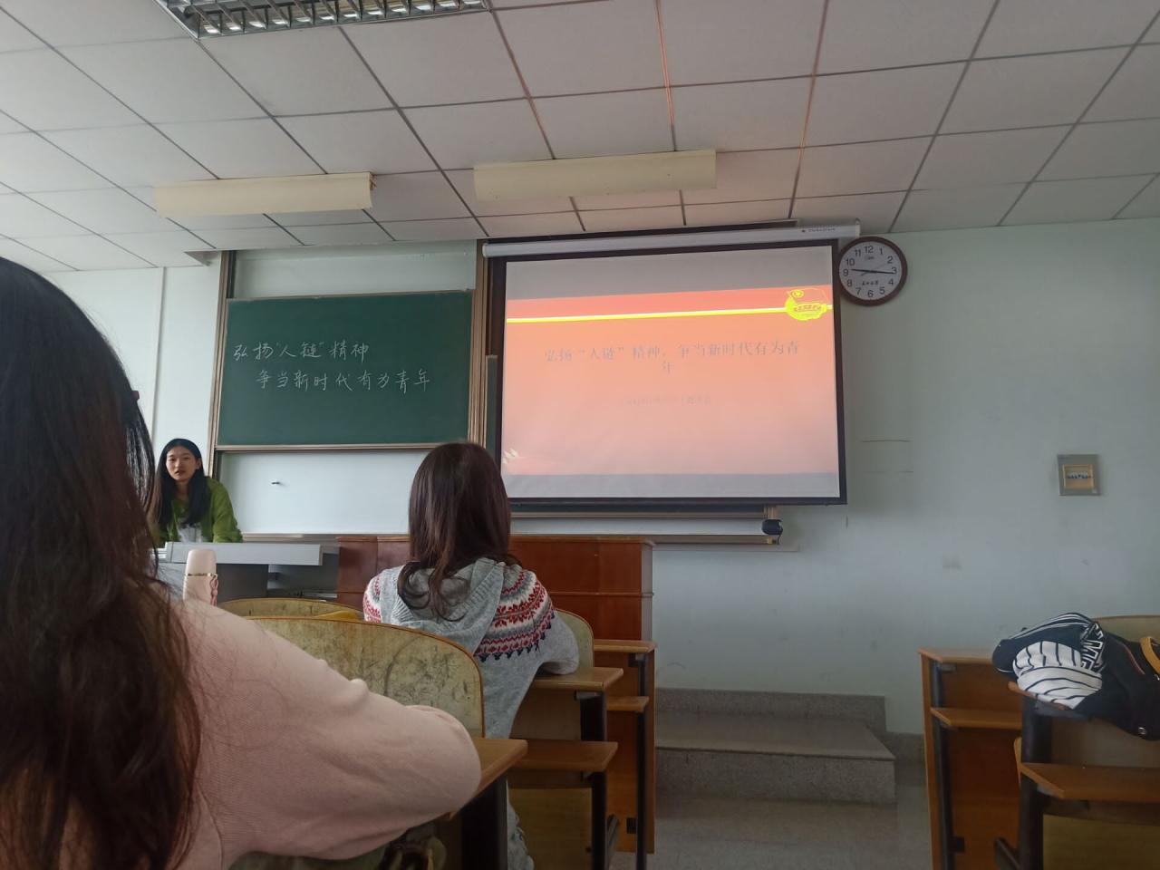 首先,由主持人播放ppt讲述大员工手拉手组成“人链”救人事件和“人链”精神及其带给我们的思考,让同学们详细了解“人链”精神并对“弘扬‘人链’精神,争当新时代有为青年”这一主题有深入的了解;
