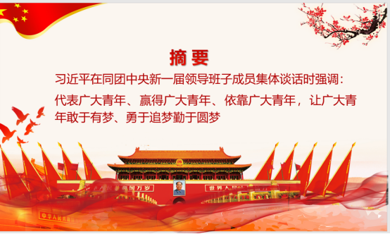 1. 观看PPT并学习习近平总书记在新一届领导班子成员集体谈话内容、王沪宁在中国共产主义青年团第十八次全国代表大会上的致词、贺军科同志在共青团十八大上的报告。