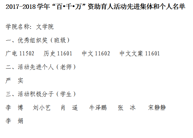 文皇冠集团网站2017-2018学年“百•千•万”资助育人活动先进集体和个人评选名单公示