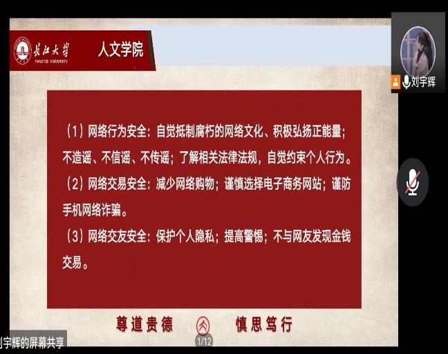 会议围绕疫情防控、防诈防骗、网络安全、防溺水、防盗防窃、用火安全以及心理健康教育七个方面展开,提醒员工要提高安全意识,做到“非必要不出校、非必要不离校、非批准不返校”,严格遵守疫情防控要求;在防诈防骗方面强调未知链接不点击、陌生来电不轻信、个人信息不透露、转账汇款多核实;在网络安全方面强调网络行为安全、交友和交易安全,自觉约束个人行为,保护个人隐私;在防溺水安全方面强调预防溺水的“六不要”原则,不要私自下水,不要贸然下水施救等;在防盗防窃方面提醒员工养成出门关门窗,注意个人财产安全;在用火安全方面强调宿舍防火“十戒”,禁止使用违规电器、不要在寝室抽烟等;在心理安全方面,提醒同学们关注自身心理状况,及时向外界寻求帮助。