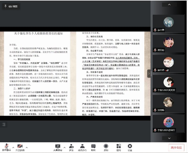 会议最后,班主任再次提醒同学们要提高自我安全意识,做好疫情防控工作,谨防电信诈骗、溺水用火等风险,做好自我保护工作,及时向同学、辅导员、老师等寻求帮助,确保自身安全。