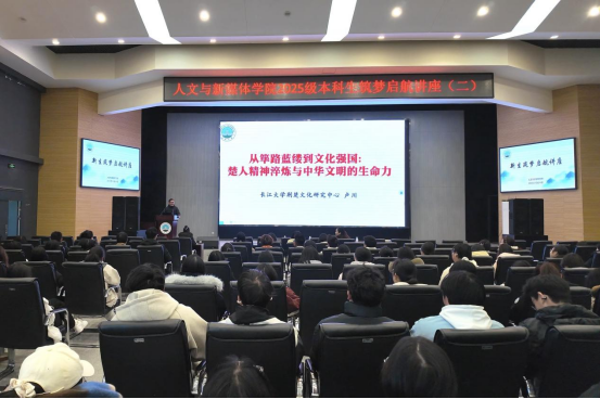 卢老师以《从筚路蓝缕到文化强国:楚人精神淬炼与中华文明生命力》为题,带领同学们回溯楚国八百年的历史脉络。从筚路蓝缕的创业精神、追新逐奇的开拓精神,到兼收并蓄的融会精神、崇武卫疆的爱国精神与重诺贵和的诚信精神,卢老师结合清华简《楚居》记载、楚墓考古发现等丰富史料,生动诠释了荆楚文化的核心内涵。他强调,荆楚文化作为中华文明的重要组成部分,其所蕴含的精神密码至今仍具有时代价值,鼓励新生从传统文化中汲取成长力量,增强文化自信。
