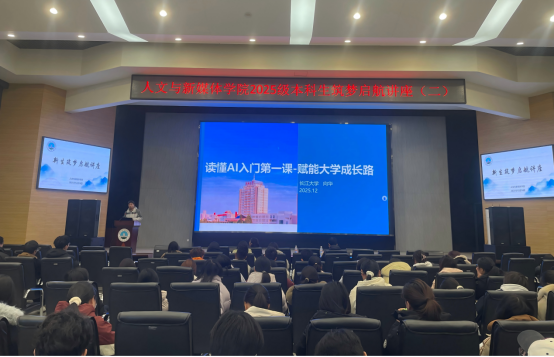 随后,向老师带来《读懂AI入门第一课——赋能大学成长之路》的主题分享。他从人类信息革命的演进历程切入,用通俗的语言解析了人工智能的本质、判断标准与工作原理,详细介绍了AIGC技术在文本生成、图像创作、视频制作等领域的应用场景。针对新生需求,向老师重点分享了DeepSeek、豆包、Kimi等主流AI工具的使用方法,以及“专业+AI”的能力提升路径,引导同学们主动学习新技术,将AI工具融入日常学习与创作,提升核心竞争力。