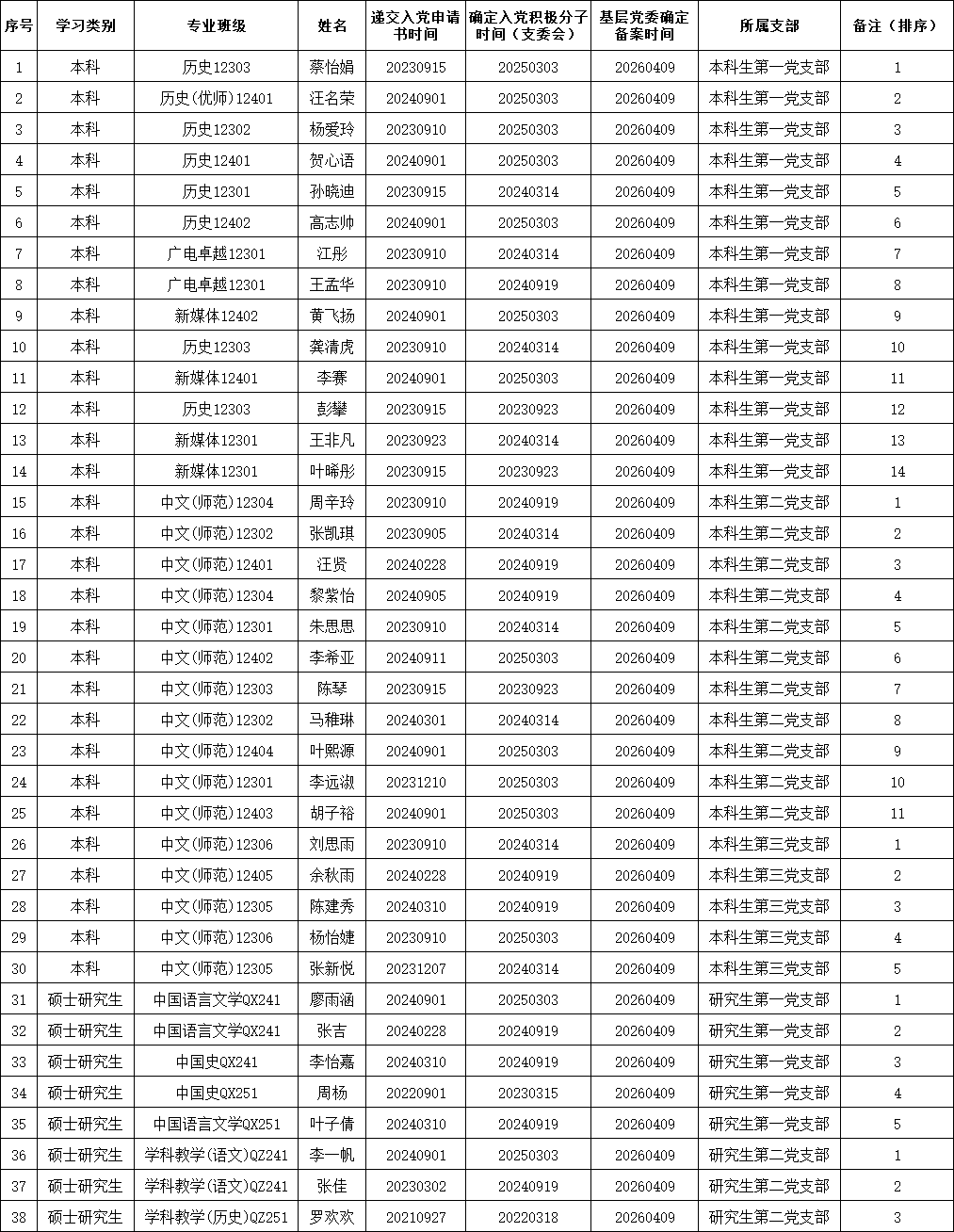 经党支部培养教育和考察,在听取培养联系人、党员和群众意见的基础上,经支部委员会研究,报上级党委备案同意,将蔡怡娟等38名同志列为发展对象。为保证发展新党员的质量,加强对发展党员工作的民主监督,现将发展对象有关情况进行公示。